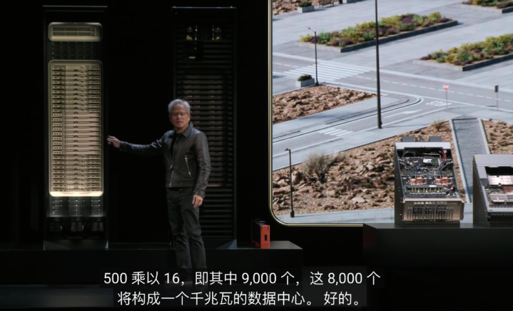 现在,那是一个机架。一个千兆瓦级的数据中心会有,来算算,16个机架大约是姑且叫它9,000,8,000个这样的将是一个一千兆瓦的数据中心。所以那将是未来的AI工厂。