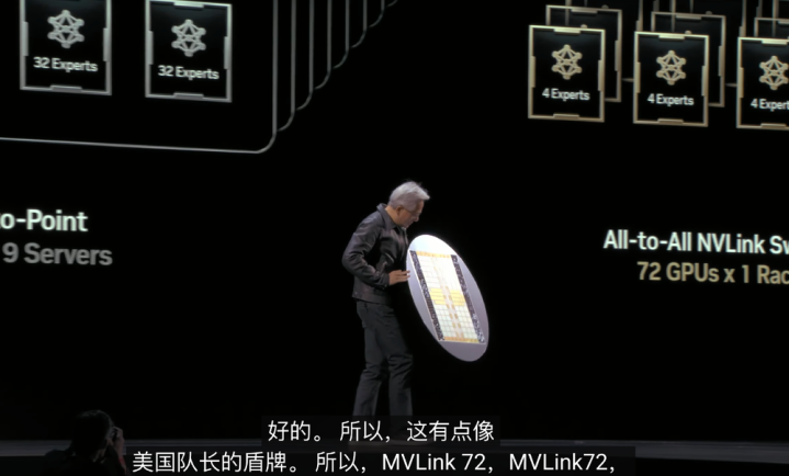 我马上让你见识它的妙处。但本质上我们所做的,好吧,这有点像美国队长的盾牌。所以NVLink72,如果我们要制造一枚巨型芯片,一块巨型GPU,它看起来会是这样。这就是我们必须进行的晶圆级加工的程度,太不可思议了。